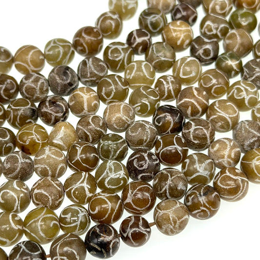 8mm coffee jade beads (dyed) - round - carved - 15" strand - approx. 50 beads