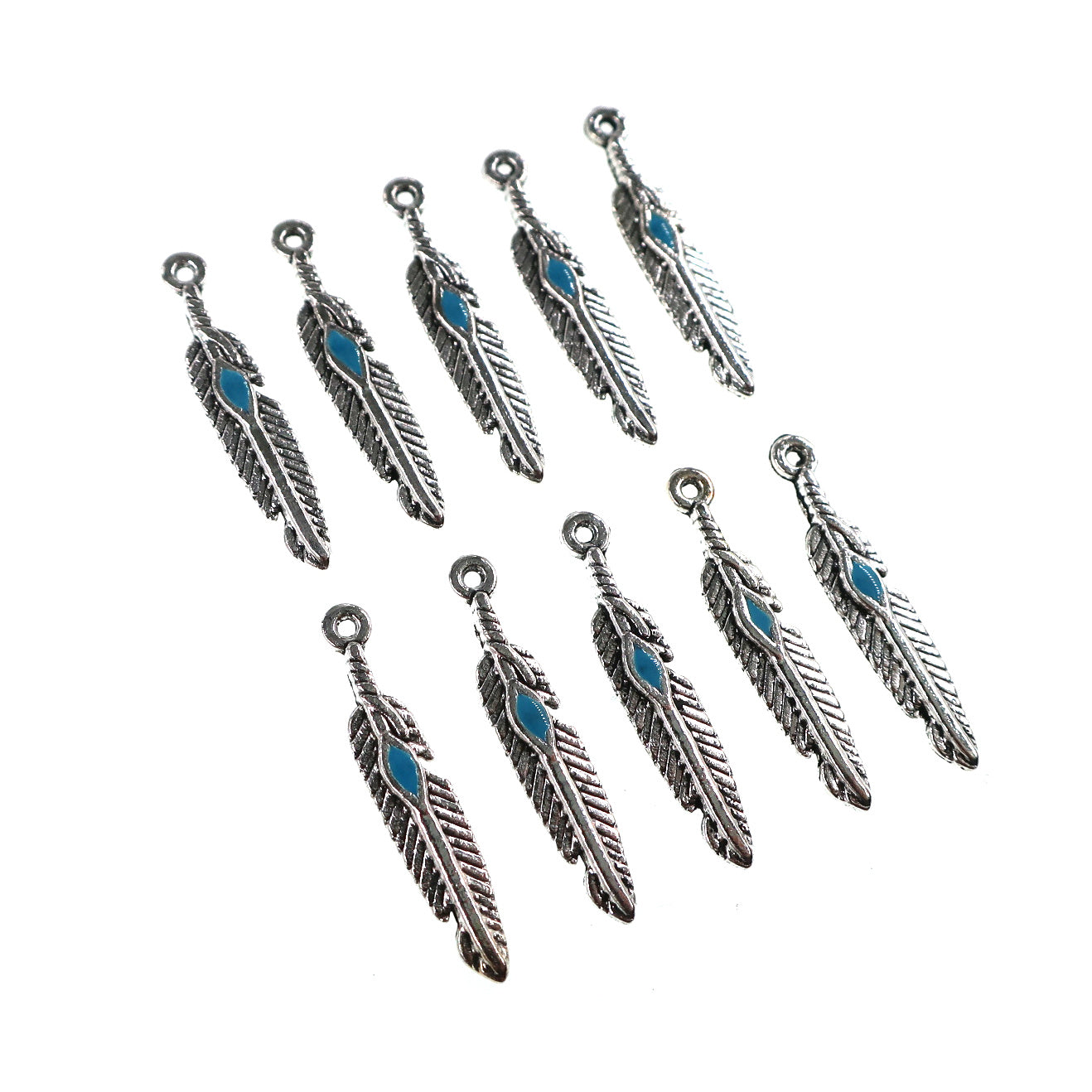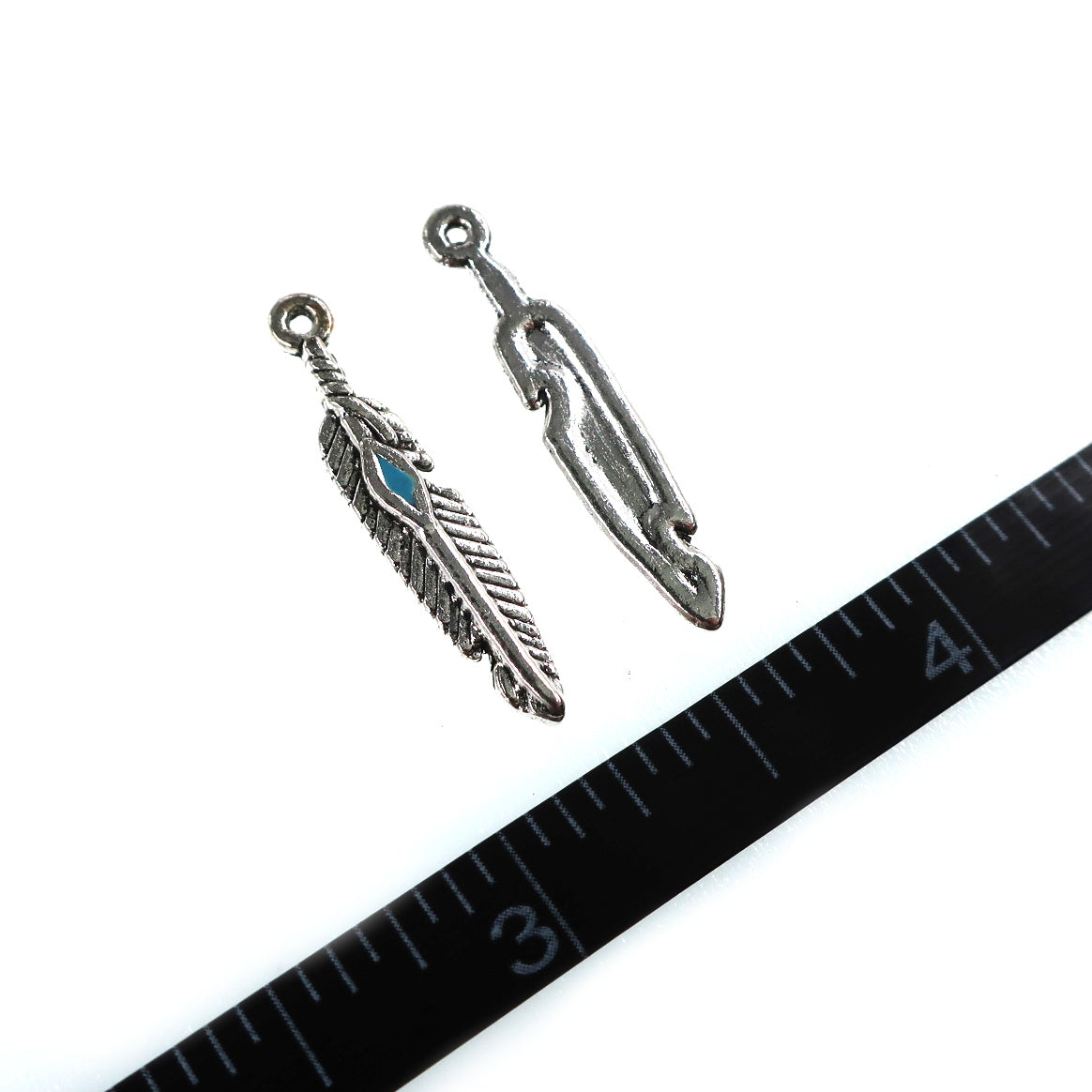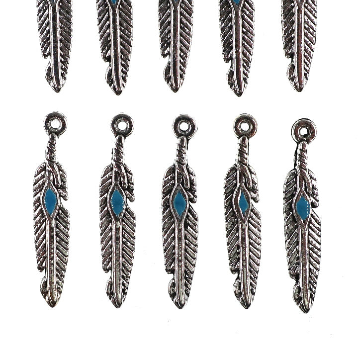 (10 pack) Feather w/ blue enamel charms - antique silver color