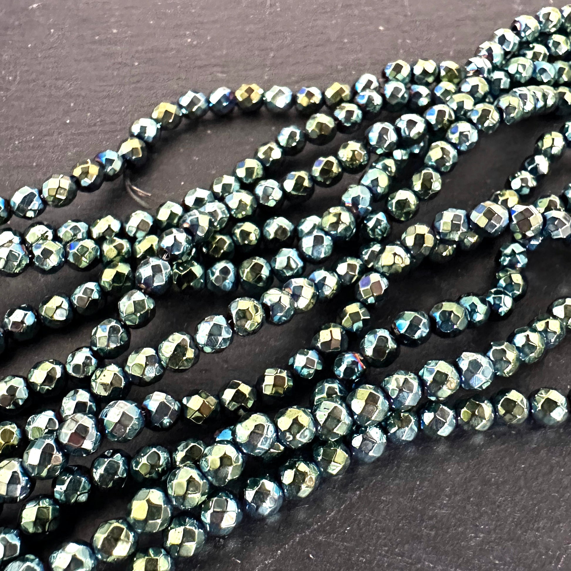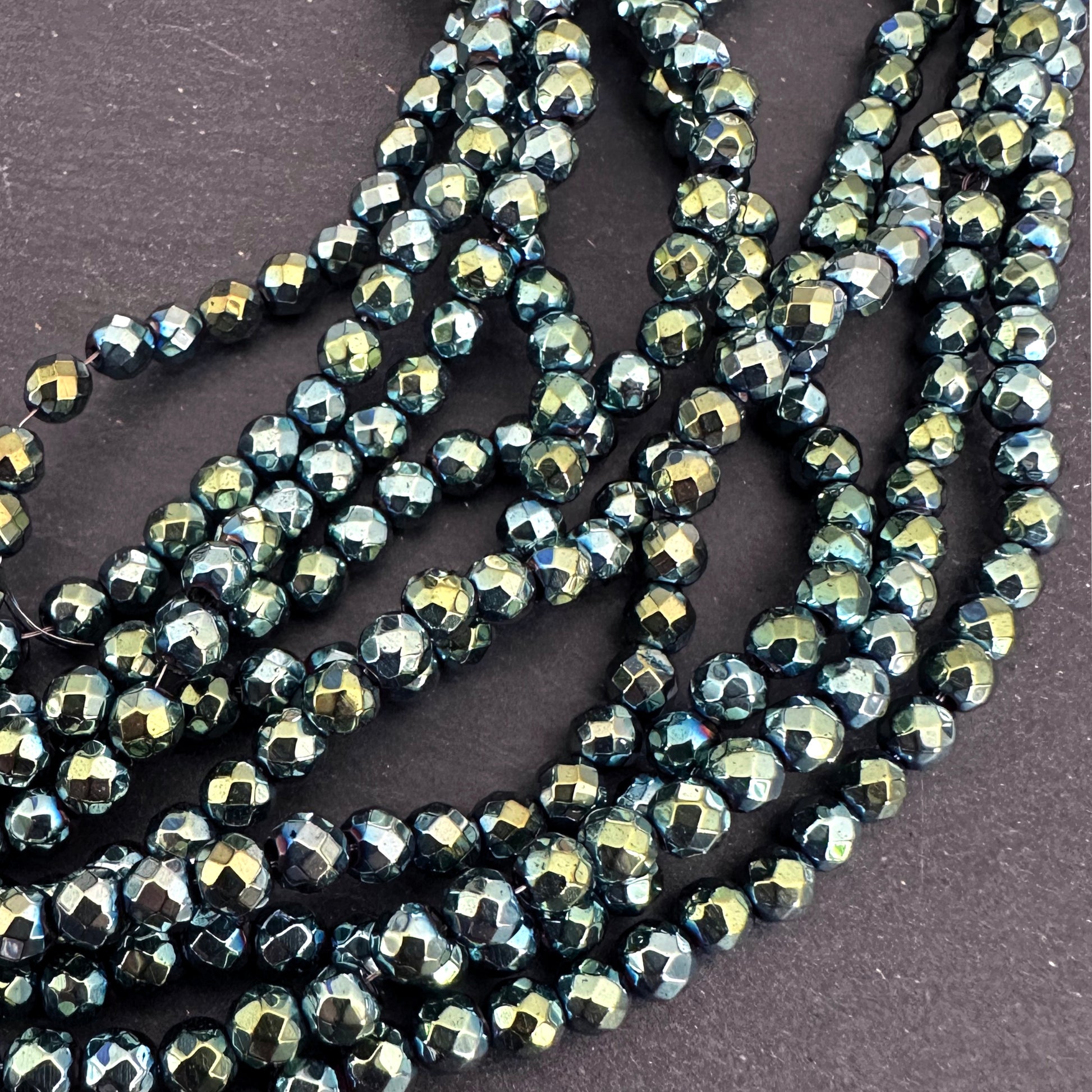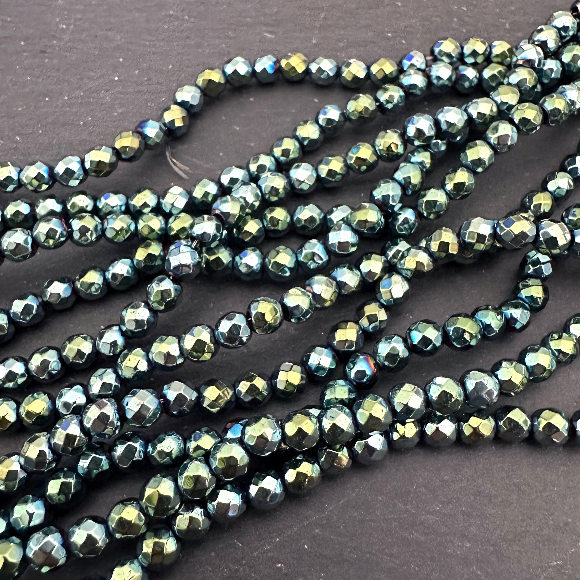 4mm green electroplated hematite beads - round - faceted - 15" strand - approx. 100 beads