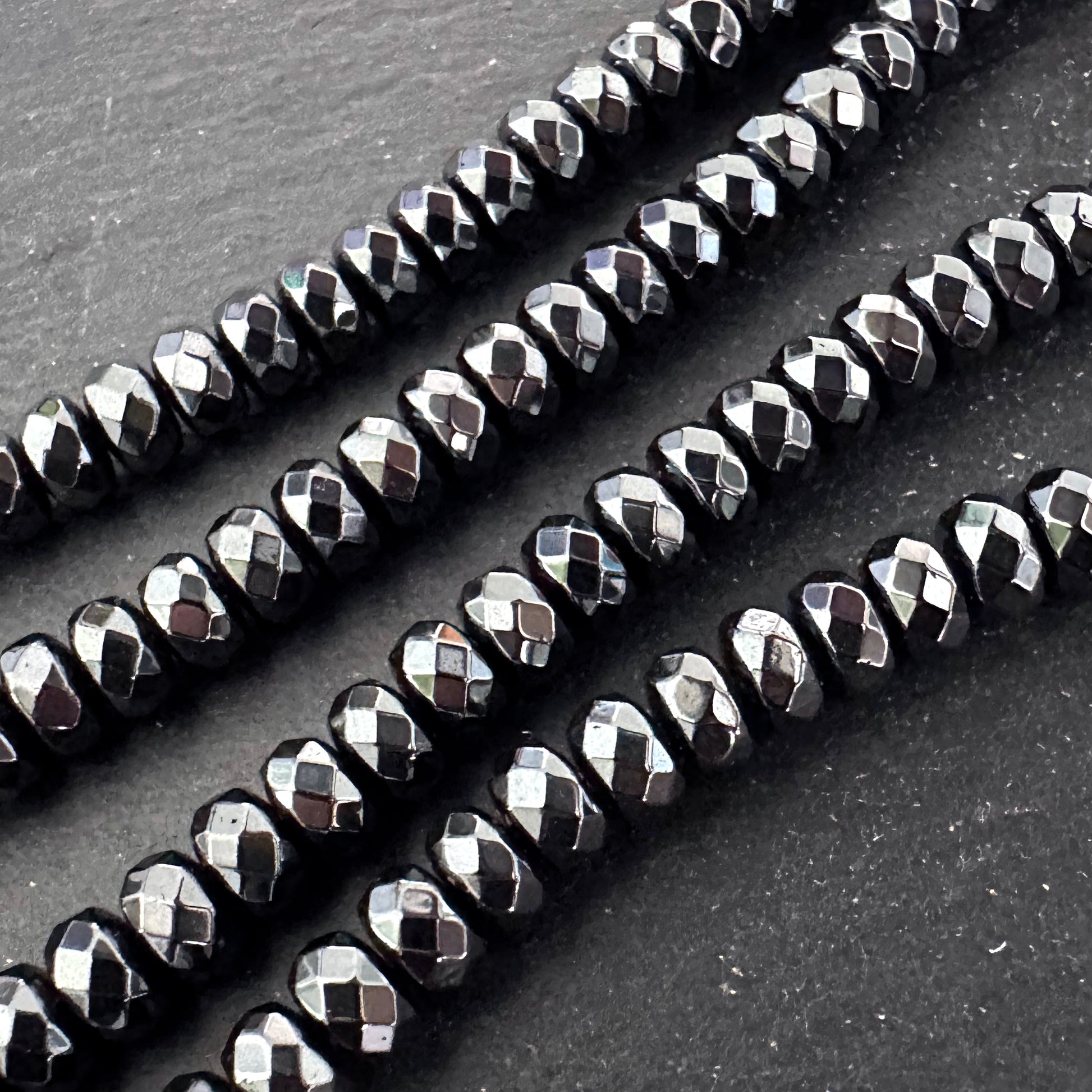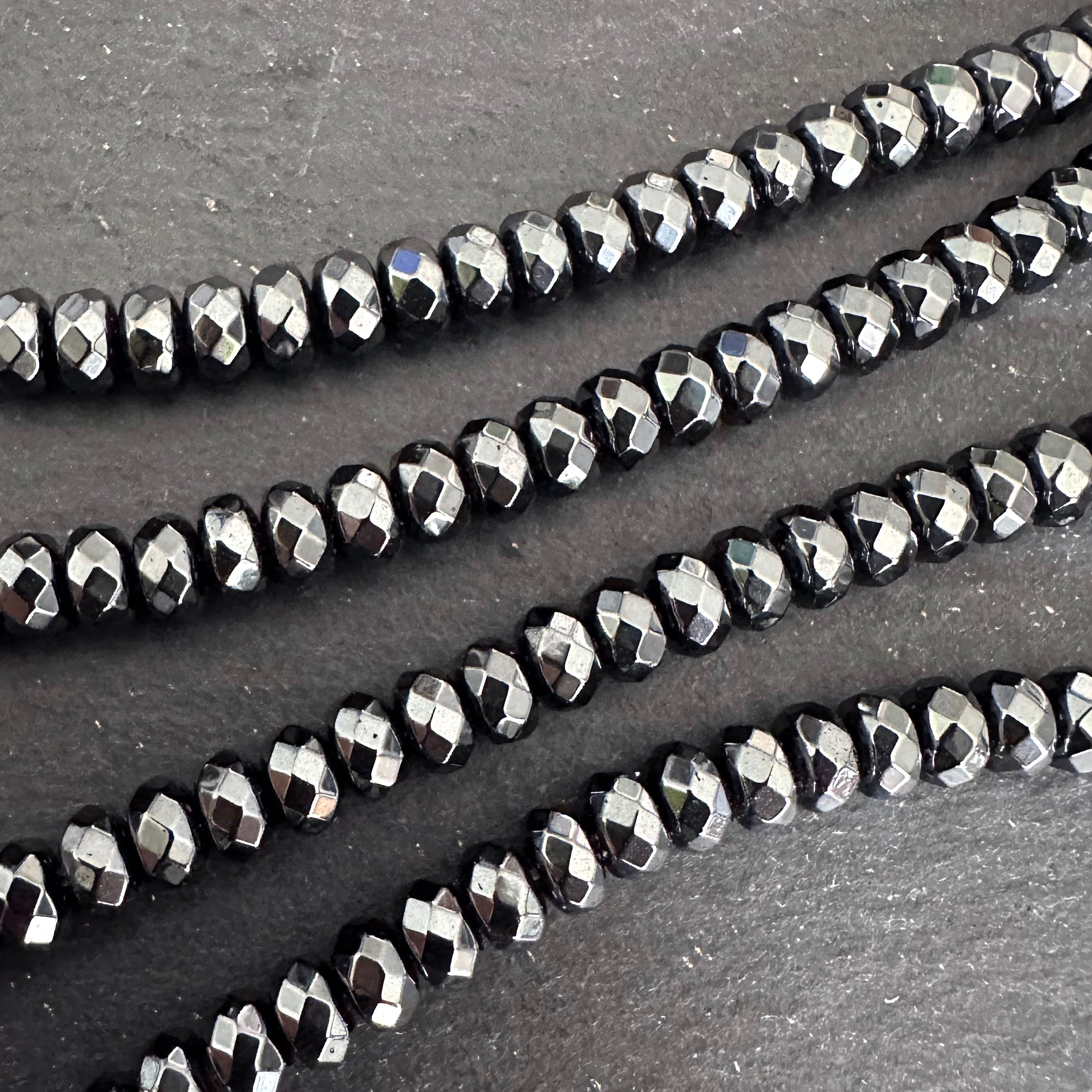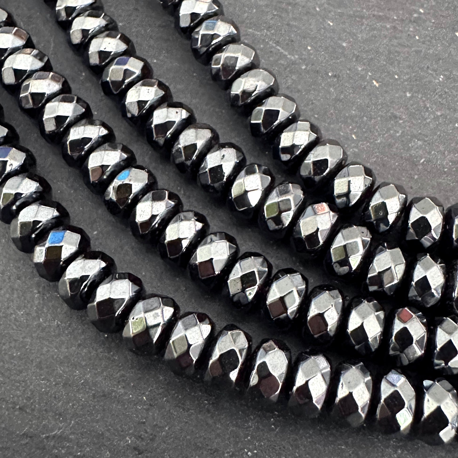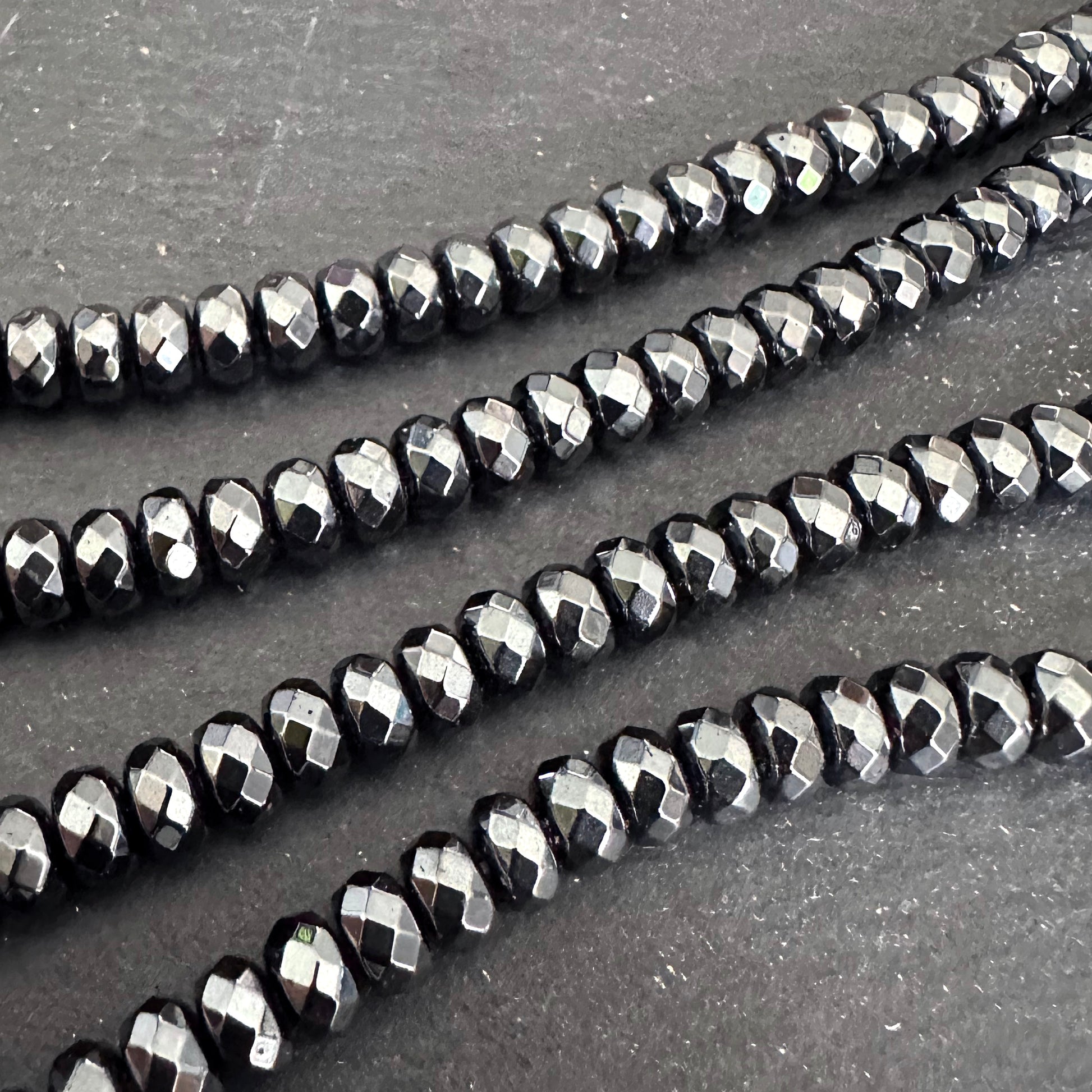 6mm black electroplated hematite beads- rondelle - faceted - 15" strand - approx. 100 beads