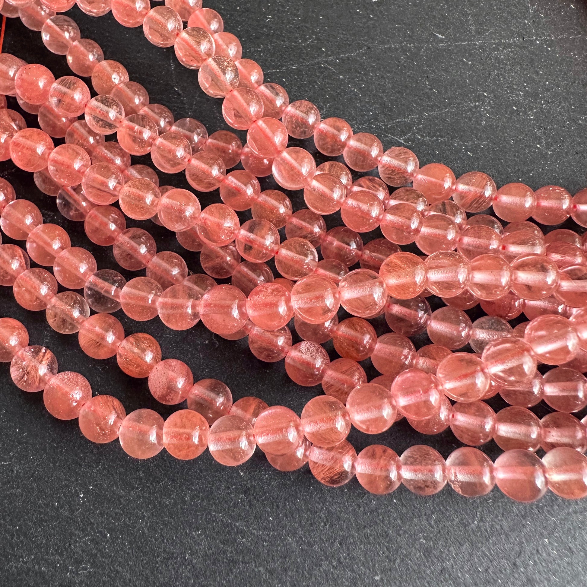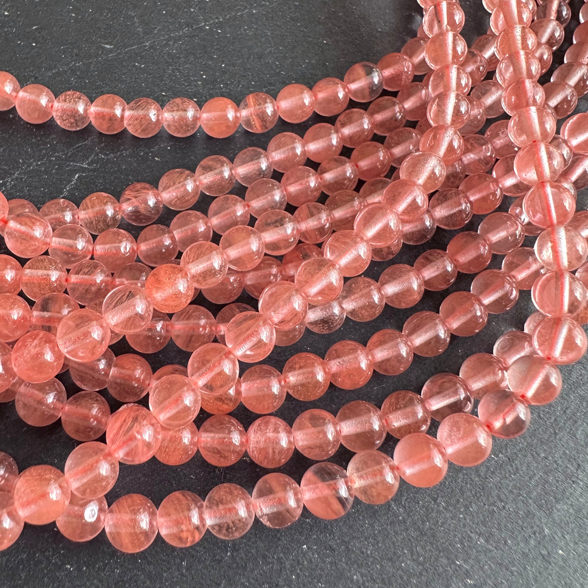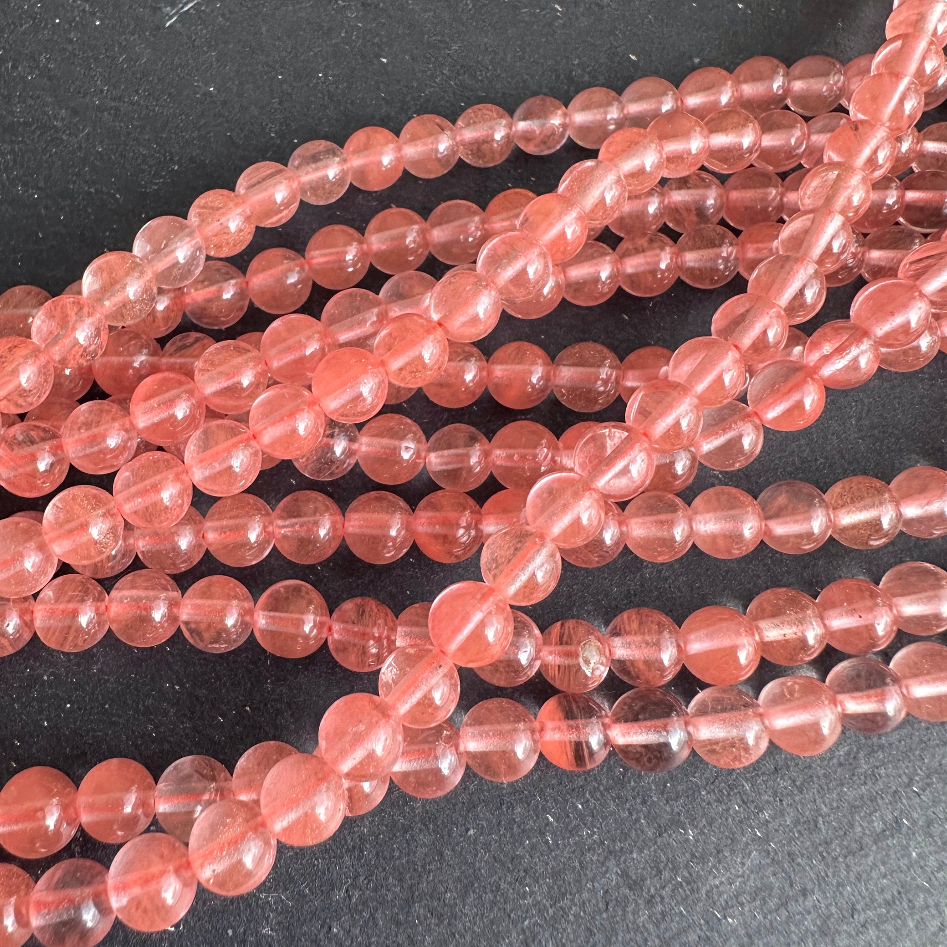 6mm cherry quartz beads (glass) - round - smooth - 15" strand - approx. 65 beads