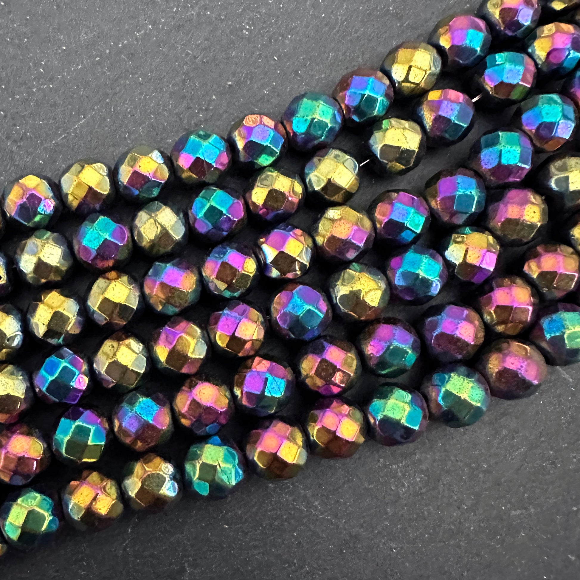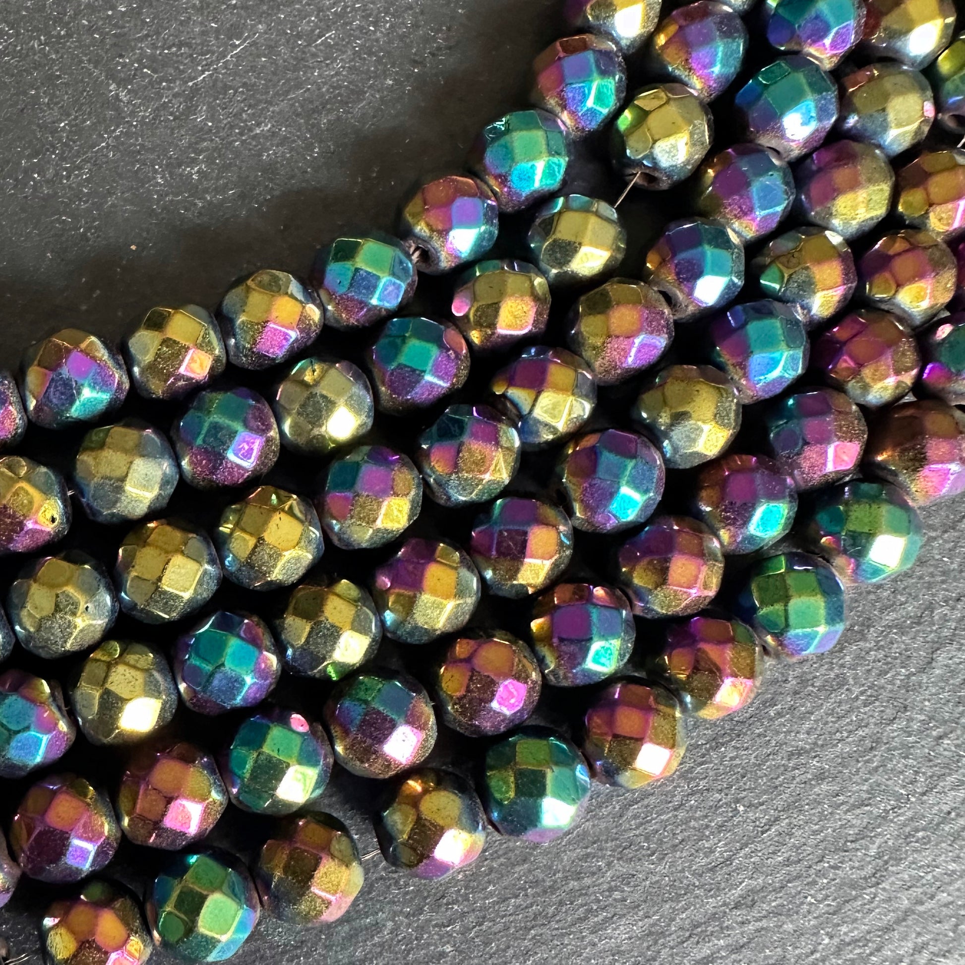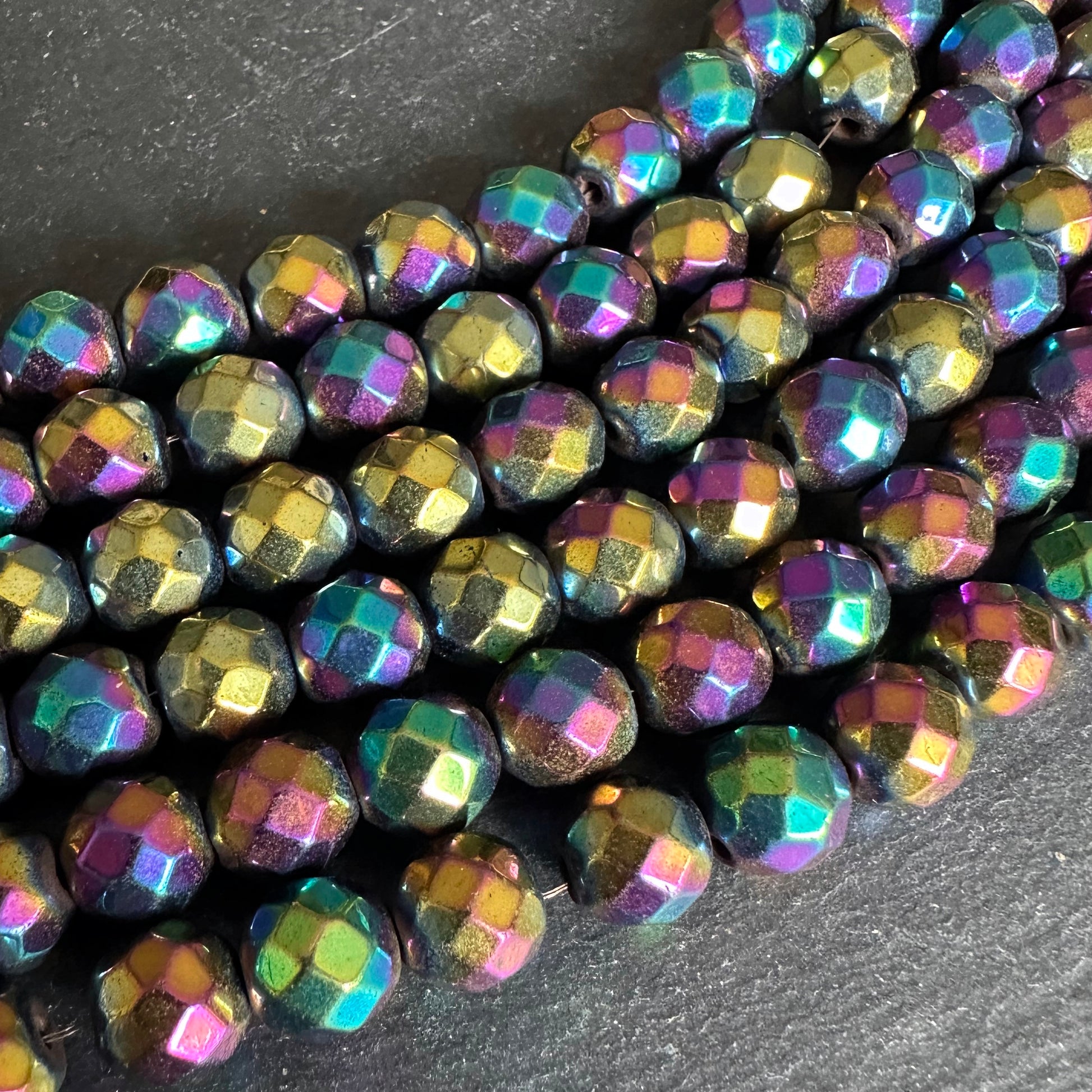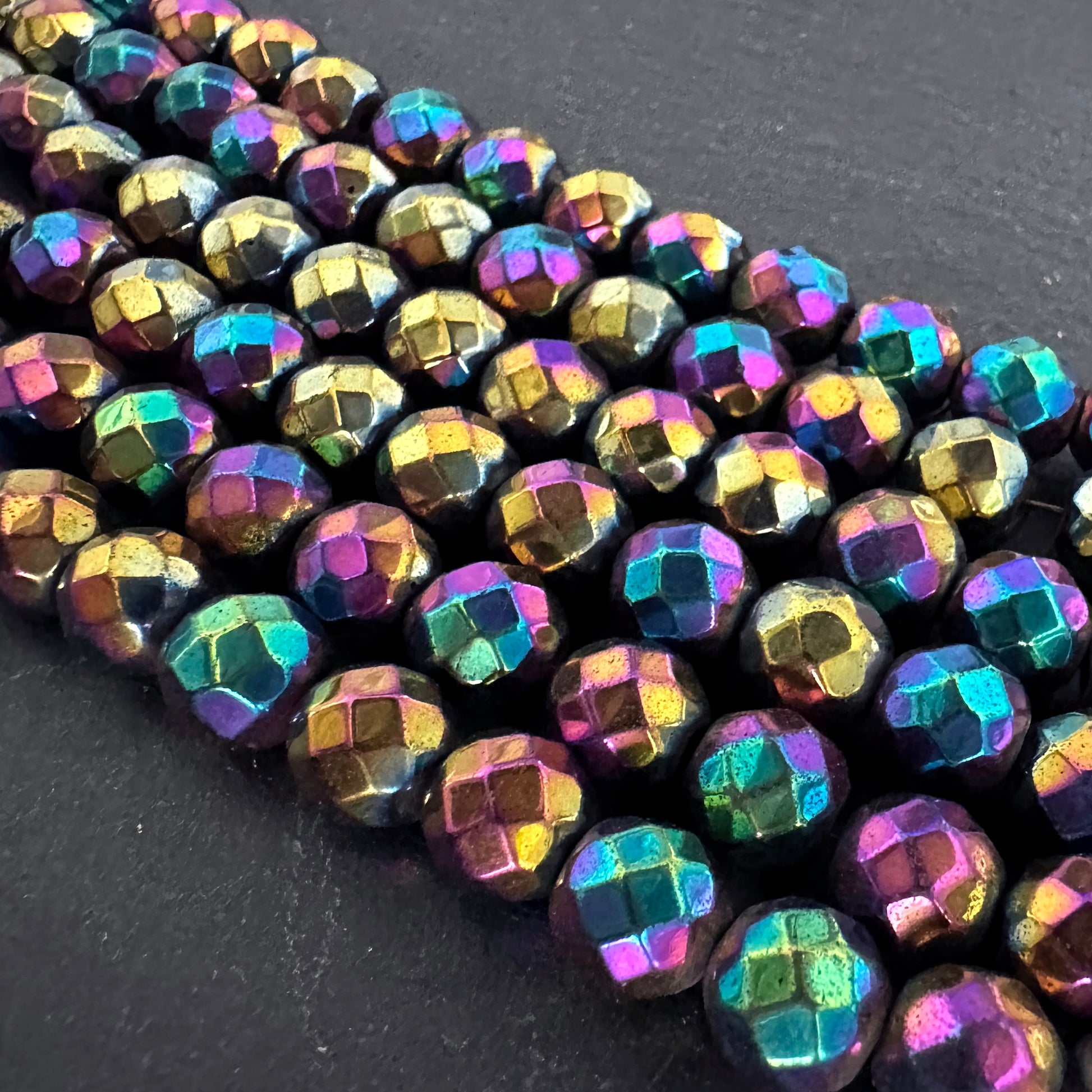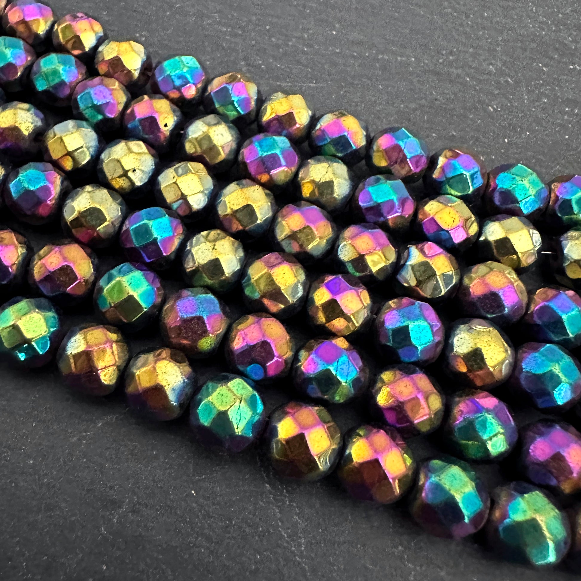 8mm rainbow electroplated hematite - round - faceted - 16" strand - approx. 50 beads